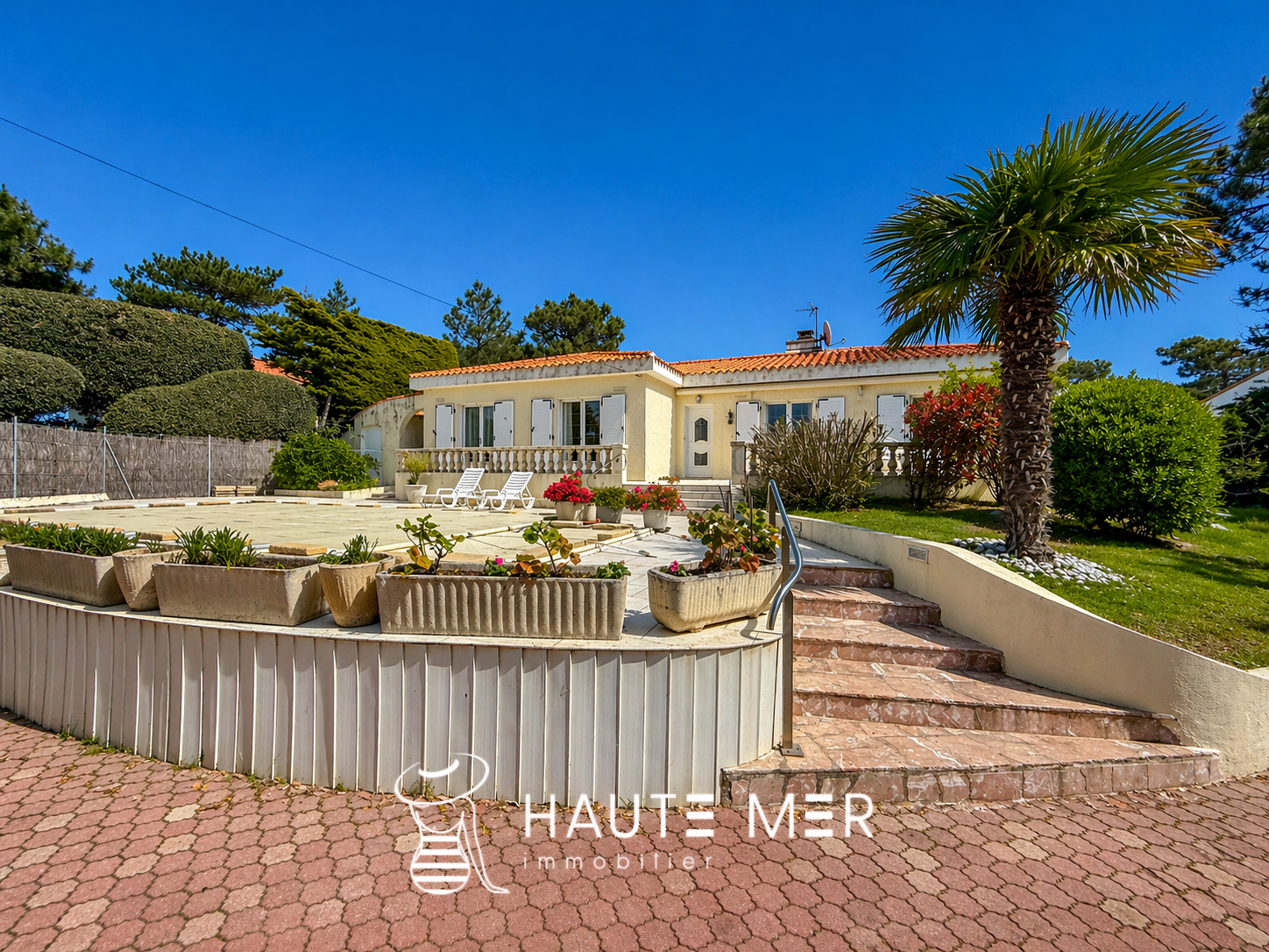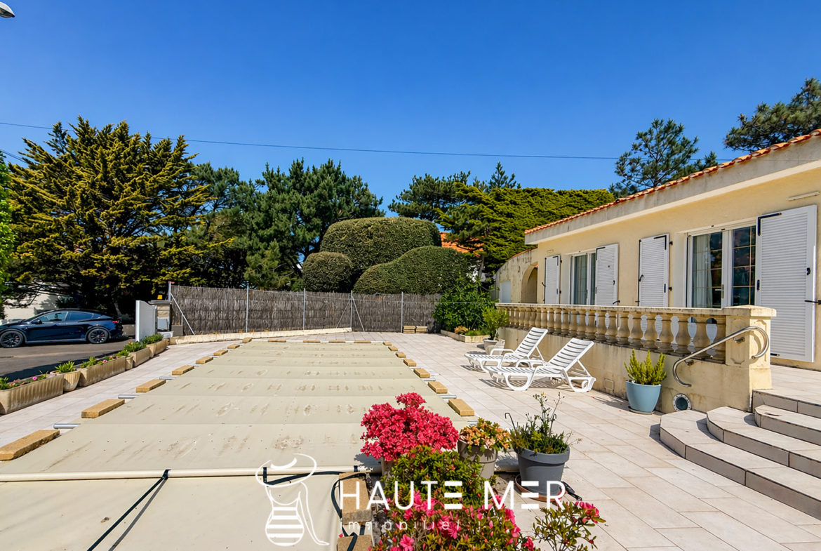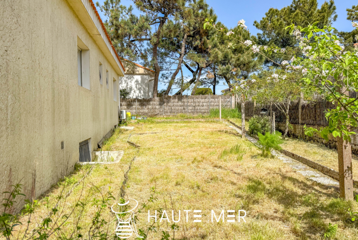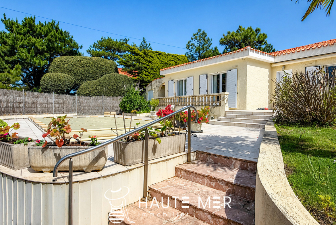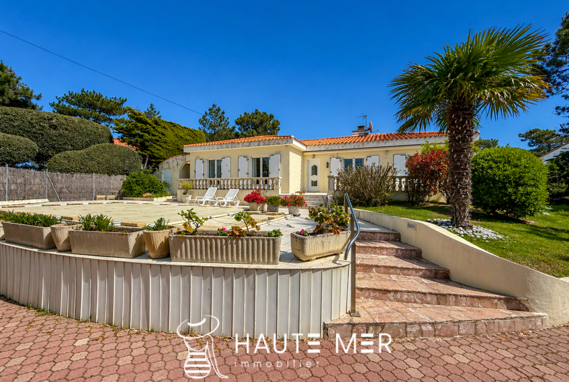 Au cœur du domaine prisé de la Pironnière, à seulement 150 mètres de la plage de Tanchet, cette maison de 181 m2 s’inscrit dans un environnement d’une rare beauté. Nichée au centre d’un terrain verdoyant de plus de 900m2, enveloppé de chênes et de pins, elle dégage une atmosphère incomparable : un cadre naturel saisissant où la lumière filtre à travers les branches, offrant une sensation immédiate de quiétude et de déconnexion. À l’intérieur, la maison révèle un séjour généreux, ouvert sur le jardin et sa piscine, laissant entrer la verdure comme un tableau vivant au fil des saisons. La cuisine, attenante, offre un espace convivial à repenser selon les envies. La partie nuit se compose de trois chambres, chacune tournée vers le jardin. Un vaste pièce polyvalente au rez-de-jardin ainsi qu’un garage de 60 m2 complètent l’ensemble, offrant un potentiel supplémentaire pour imaginer de nouveaux aménagements. Un bien rare, empreint d’une atmosphère nature et apaisante, qui promet de superbes perspectives de rénovation et un cadre de vie privilégié au cœur de la Pironnière.