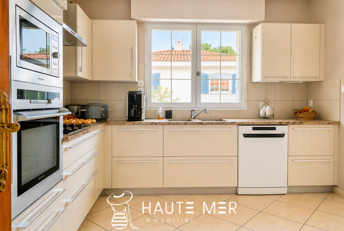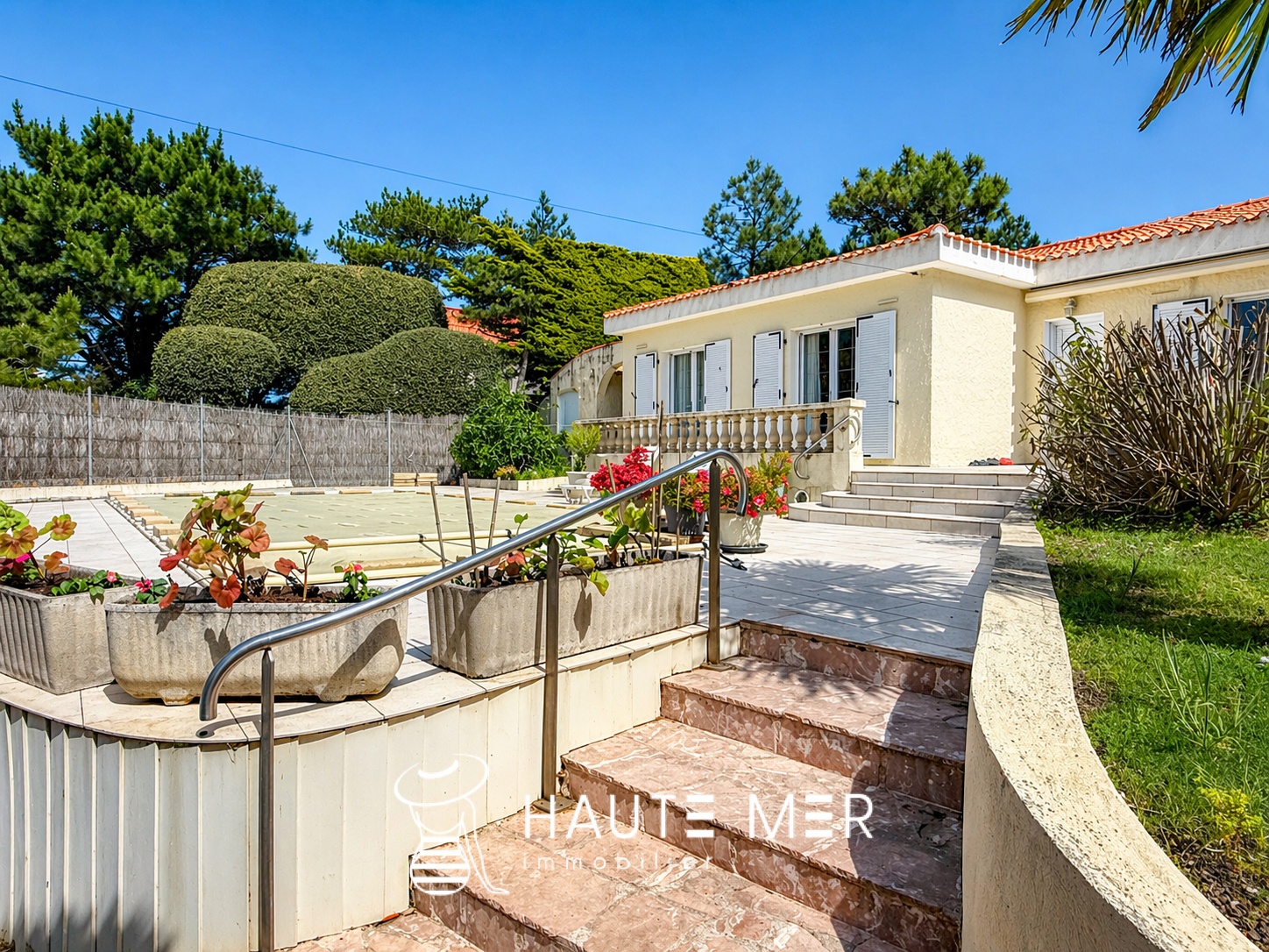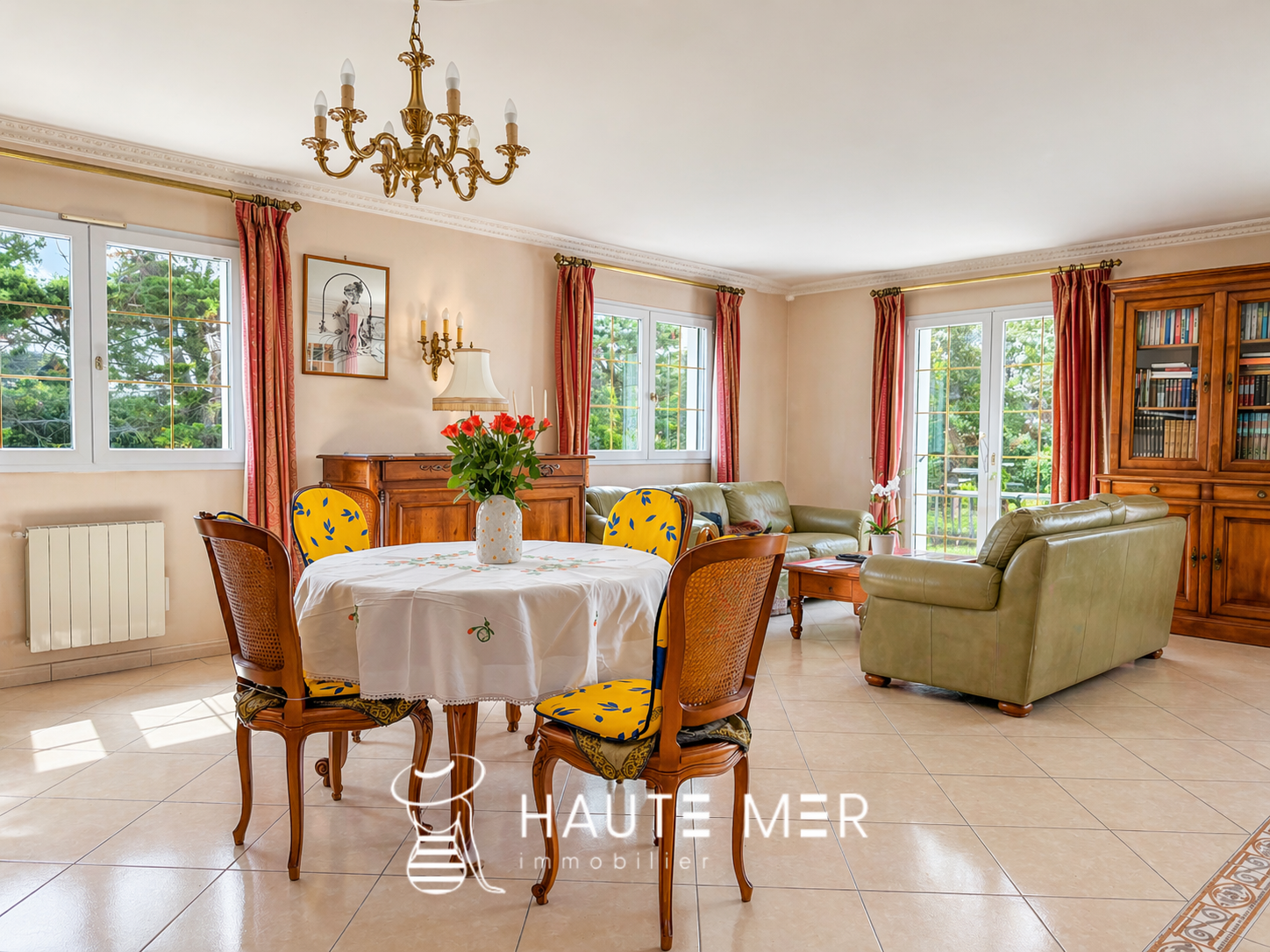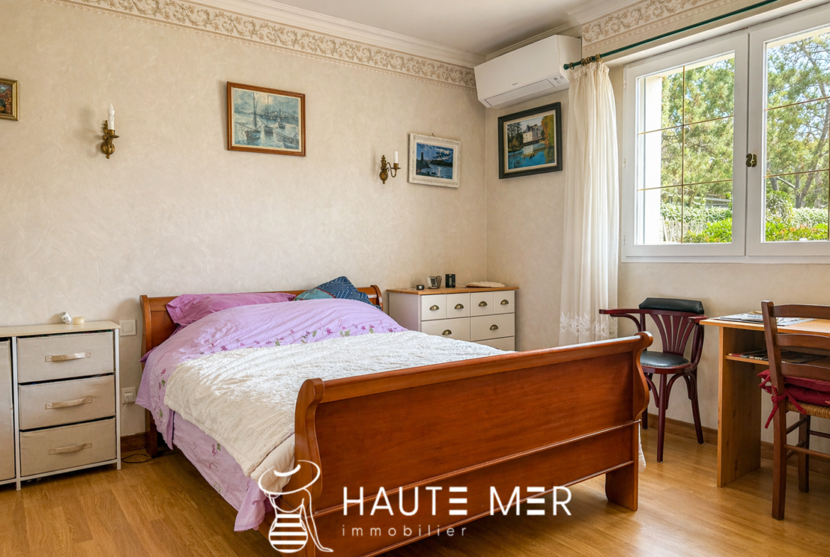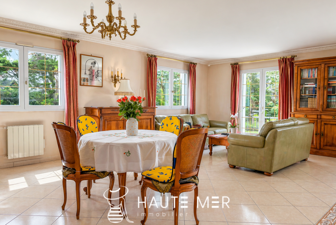 Au cœur du domaine prisé de la Pironnière, à seulement 150 mètres de la plage de Tanchet, cette maison de 181 m2 s’inscrit dans un environnement d’une rare beauté. Nichée au centre d’un terrain verdoyant de plus de 900m2, enveloppé de chênes et de pins, elle dégage une atmosphère incomparable : un cadre naturel saisissant où la lumière filtre à travers les branches, offrant une sensation immédiate de quiétude et de déconnexion. À l’intérieur, la maison révèle un séjour généreux, ouvert sur le jardin et sa piscine, laissant entrer la verdure comme un tableau vivant au fil des saisons. La cuisine, attenante, offre un espace convivial à repenser selon les envies. La partie nuit se compose de trois chambres, chacune tournée vers le jardin. Un vaste pièce polyvalente au rez-de-jardin ainsi qu’un garage de 60 m2 complètent l’ensemble, offrant un potentiel supplémentaire pour imaginer de nouveaux aménagements. Un bien rare, empreint d’une atmosphère nature et apaisante, qui promet de superbes perspectives de rénovation et un cadre de vie privilégié au cœur de la Pironnière.