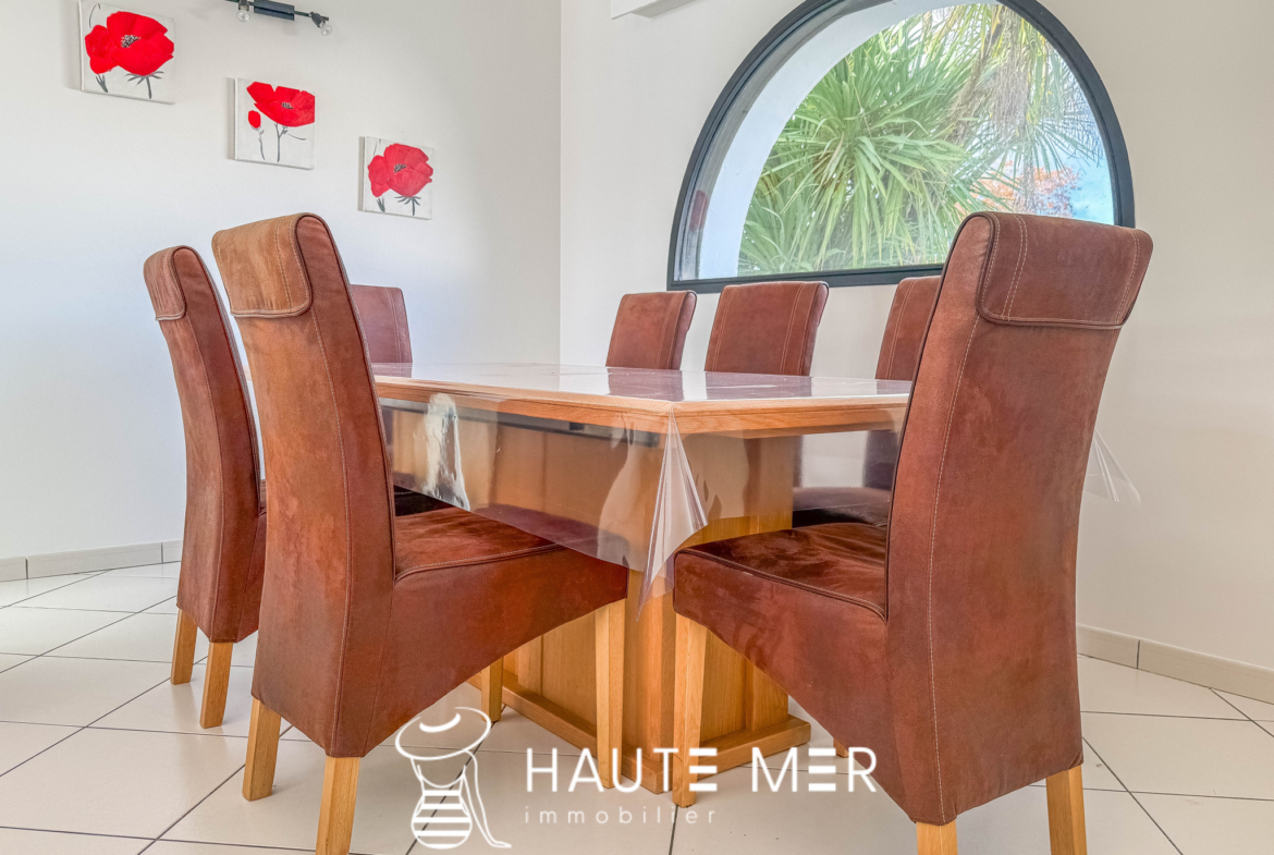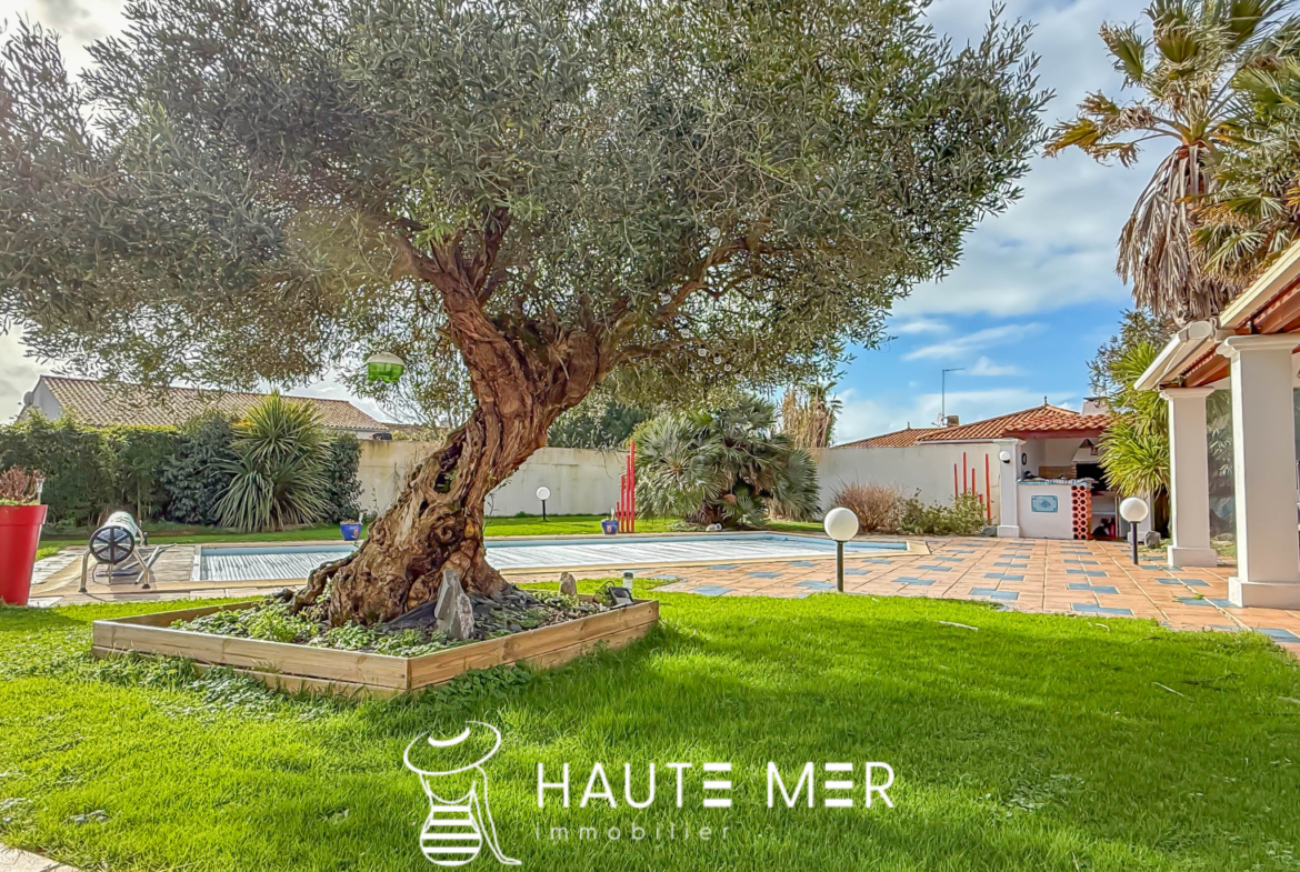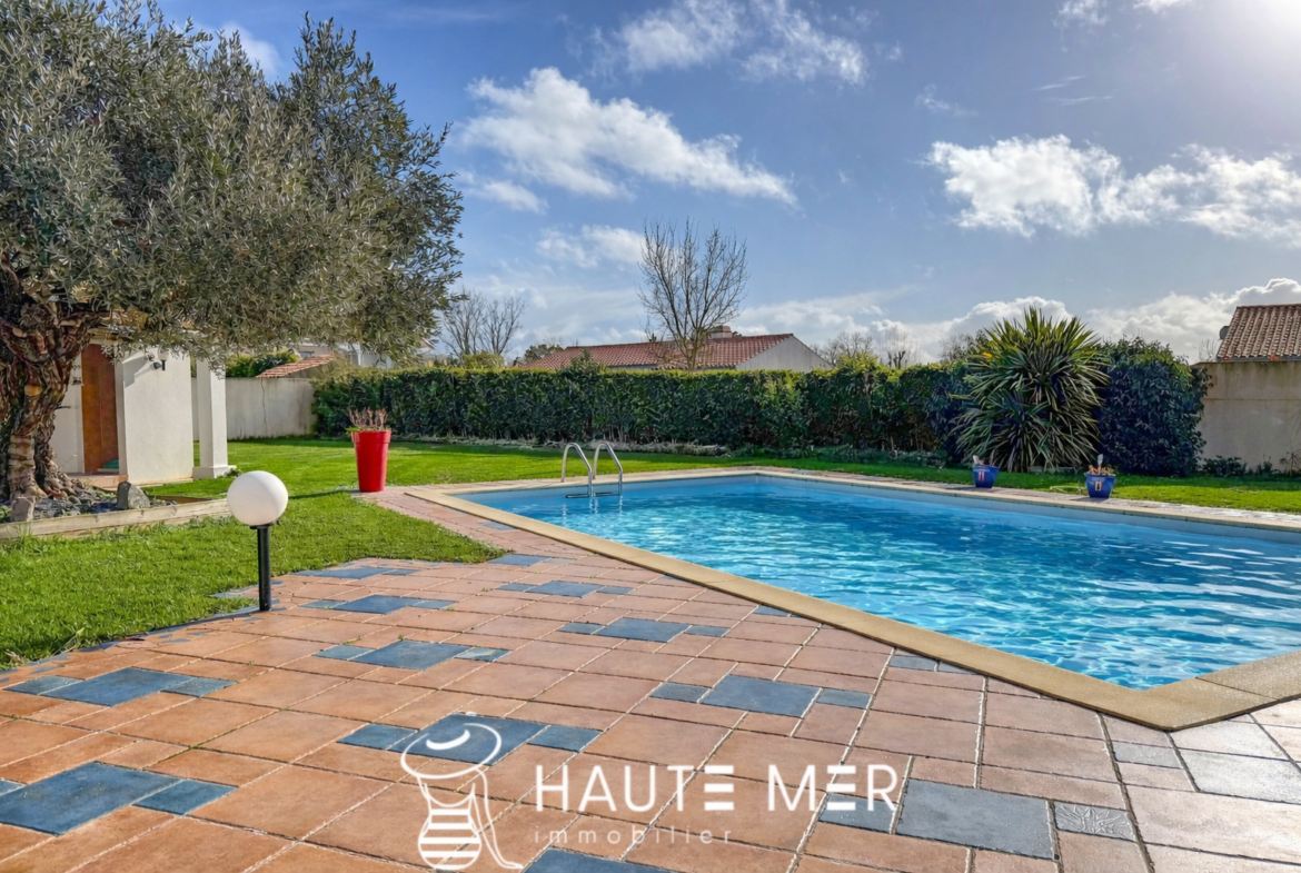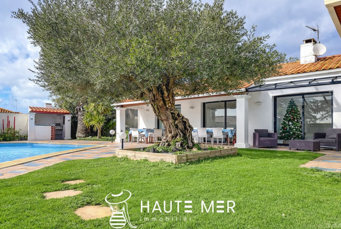 Dans un environnement de qualité, au cœur d’un cadre verdoyant et préservé, cette maison de plain-pied séduit par son harmonie avec la nature et ses volumes généreux, tournée vers un magnifique terrain de 1 300 m2 agrémenté d’une piscine exposée plein sud. La pièce de vie, véritable cœur de la maison, dévoile un spacieux séjour avec cheminée d’environ 50 m2, largement ouvert sur une vaste terrasse couverte qui prolonge naturellement les espaces vers le jardin. Ici, l’intérieur et l’extérieur dialoguent en douceur, offrant une atmosphère propice à la détente et aux moments partagés. La cuisine équipée, conviviale et fonctionnelle, s’ouvre également sur la terrasse, facilitant une vie quotidienne tournée vers l’extérieur. La suite parentale, composée d’une chambre, d’une salle de bains et de rangements, bénéficie elle aussi d’un accès direct à la terrasse et au jardin, offrant un espace intime et lumineux. L’espace nuit accueille deux chambres d’invités se partageant une salle d’eau, ainsi qu’un bureau. Une pièce indépendante, pouvant aisément devenir une chambre supplémentaire, complète l’ensemble. Un cellier et un grand garage indépendant d’environ 40 m2 viennent parfaire les prestations de cette propriété. Une maison chaleureuse et fonctionnelle, où la qualité de l’environnement, les volumes et l’ouverture sur le jardin composent un cadre de vie particulièrement agréable.