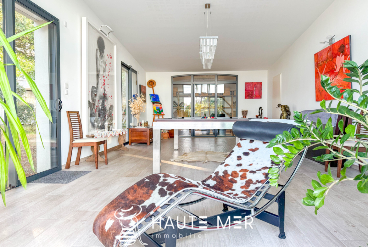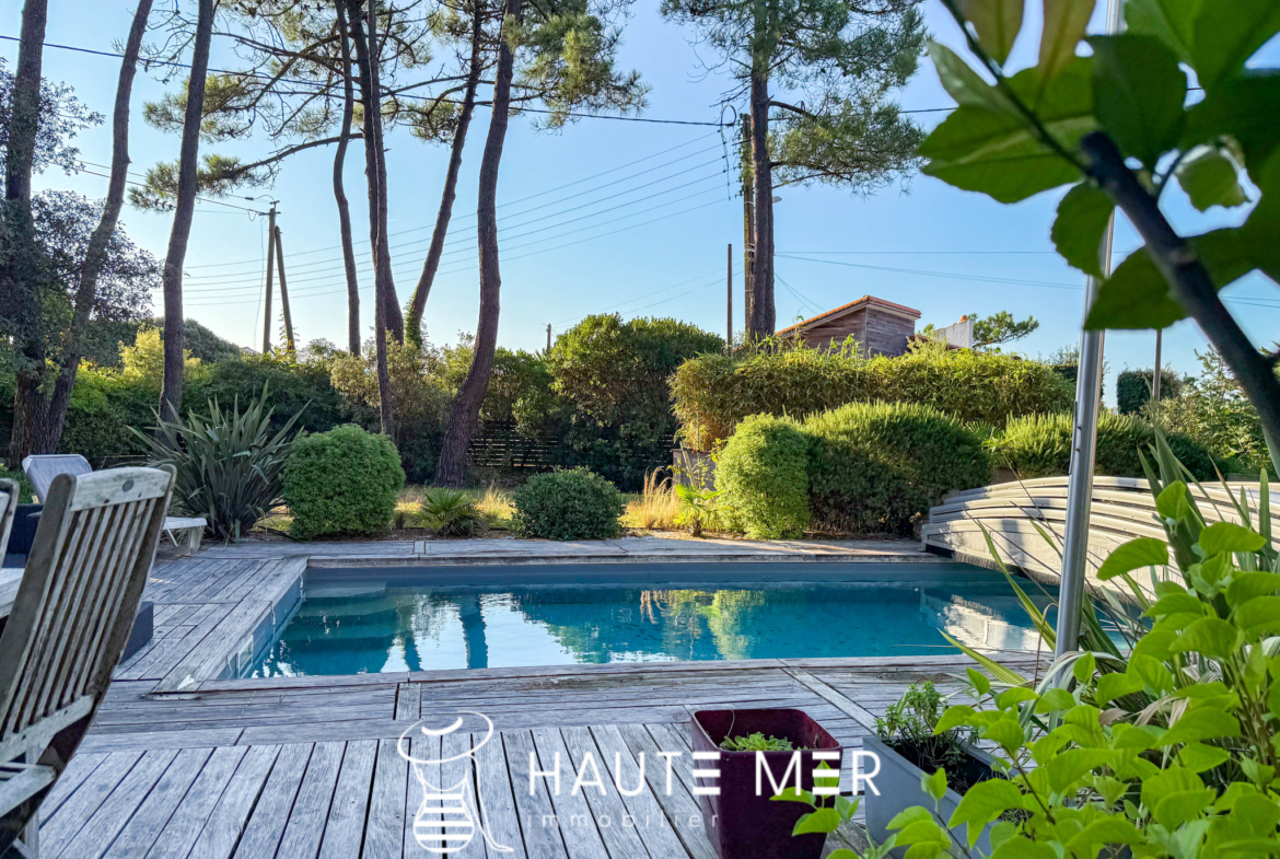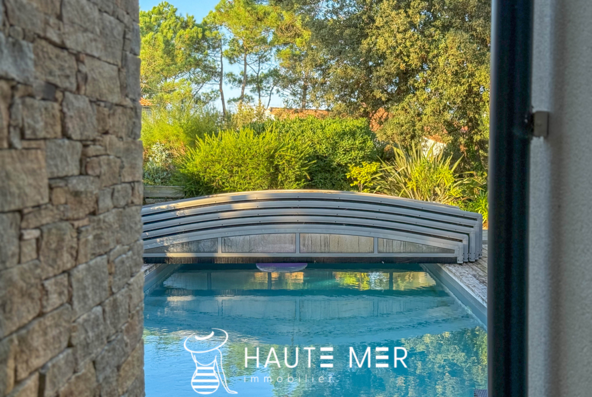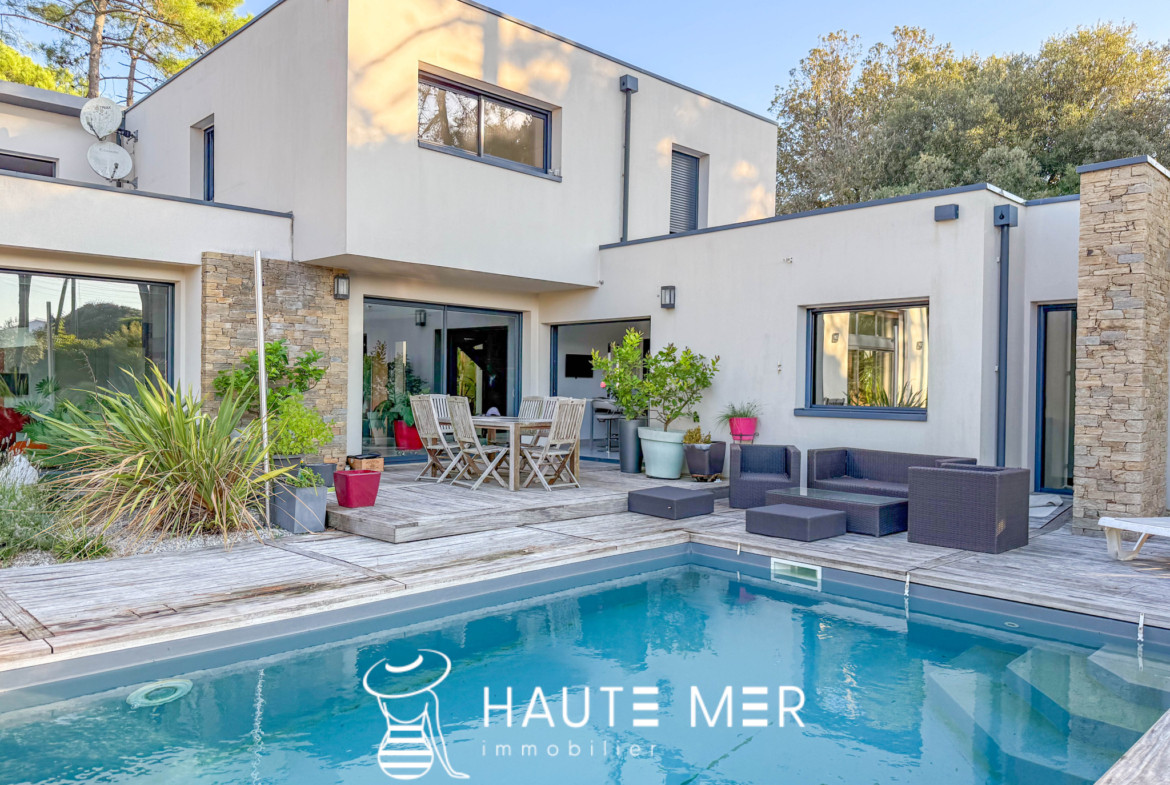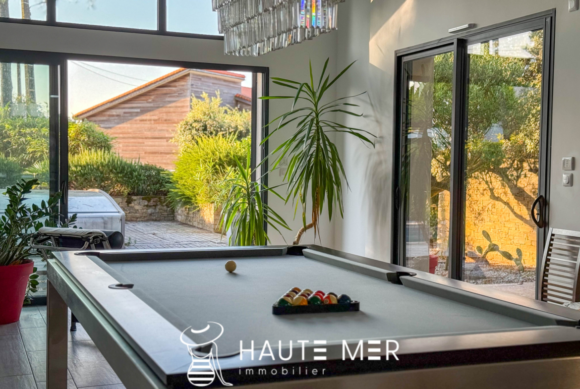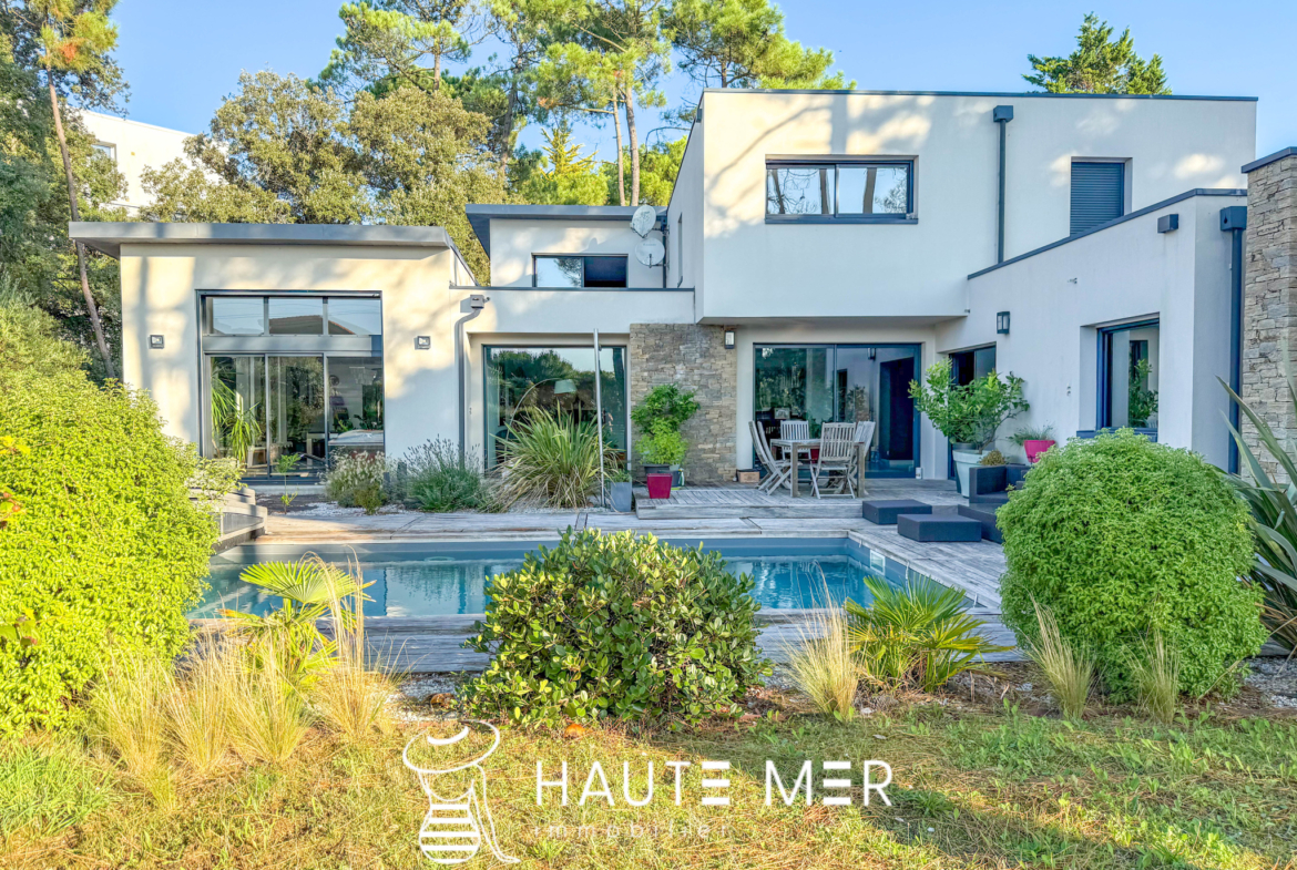 À quelques encablures de l’océan, dans le quartier recherché du domaine de la Pironnière, se dévoile une villa élégante de près de 300 m2, entourée d’un jardin paysager de 1 800 m2. La lumière y circule librement : l’espace de vie est rythmé par trois agréables pièces se prolongeant chacune sur le jardin paysagé. La cuisine et son espace repas, lieu de partage et de convivialité, profitent également de l’espace extérieur. La suite parentale, avec dressing et salle de bains, compose un refuge intime. Une chambre indépendante, dotée de sa salle d’eau, accueille vos hôtes en toute sérénité. À l’étage, deux chambres, un bureau lumineux et une salle de cinéma complètent l’ensemble. À l’extérieur, le jardin aux essences méditerranéennes guide vos pas vers une piscine chauffée, promesse de moments suspendus entre ciel et mer. Un triple garage ainsi qu’une spacieuse cave à vin complètent cette villa contemporaine. Un cadre de vie rare, où l’espace et la douceur de l’Atlantique se rencontrent.