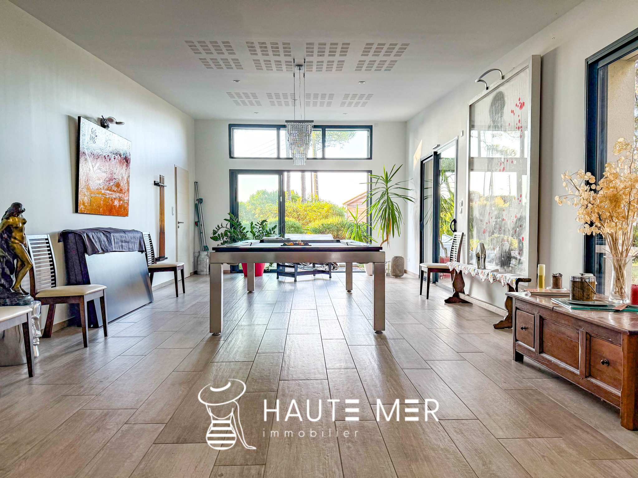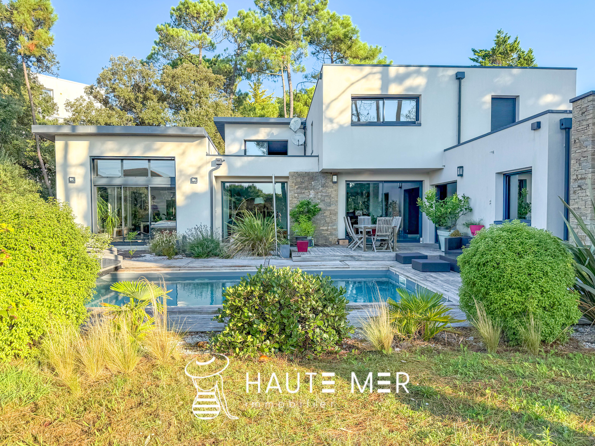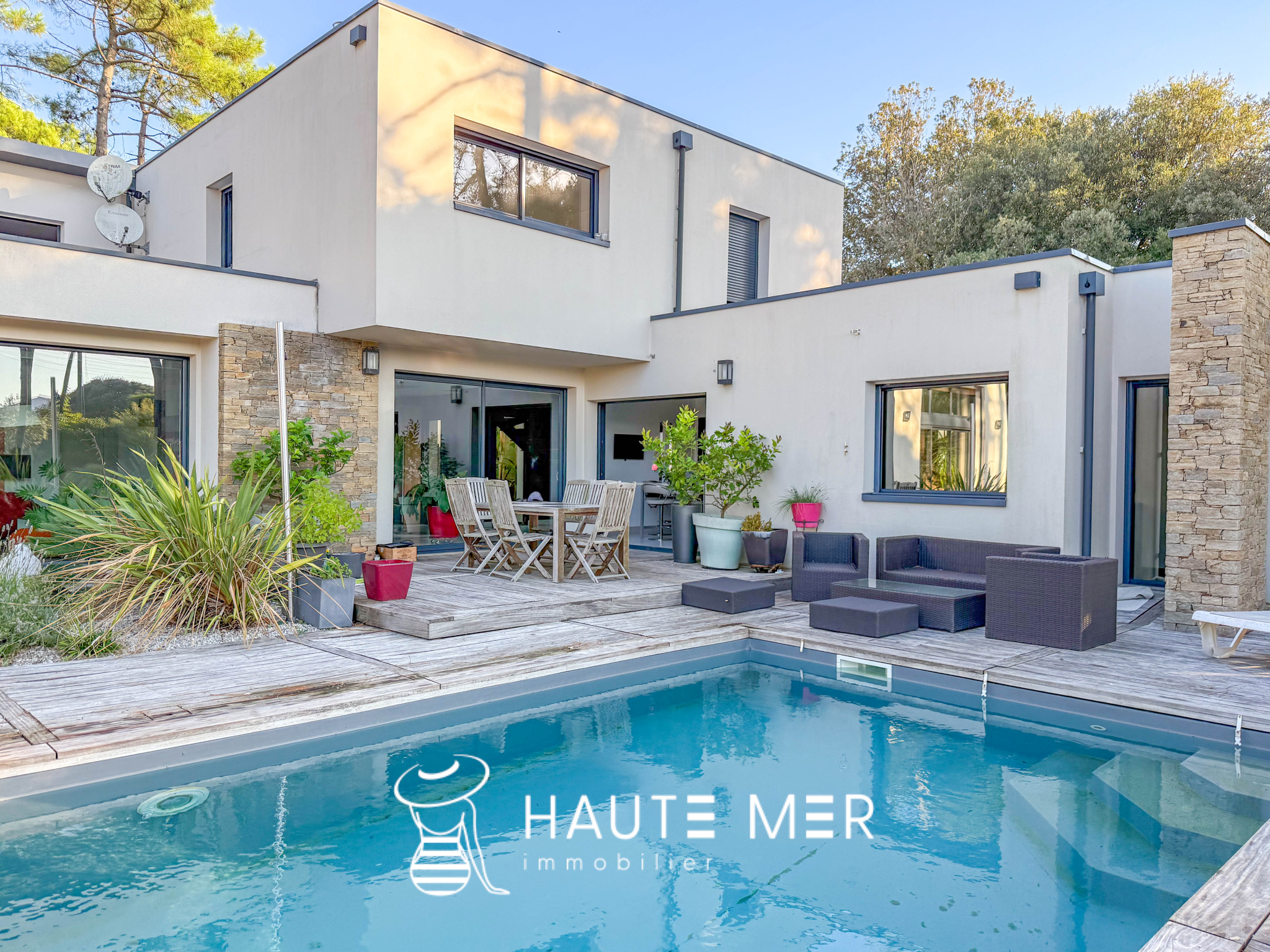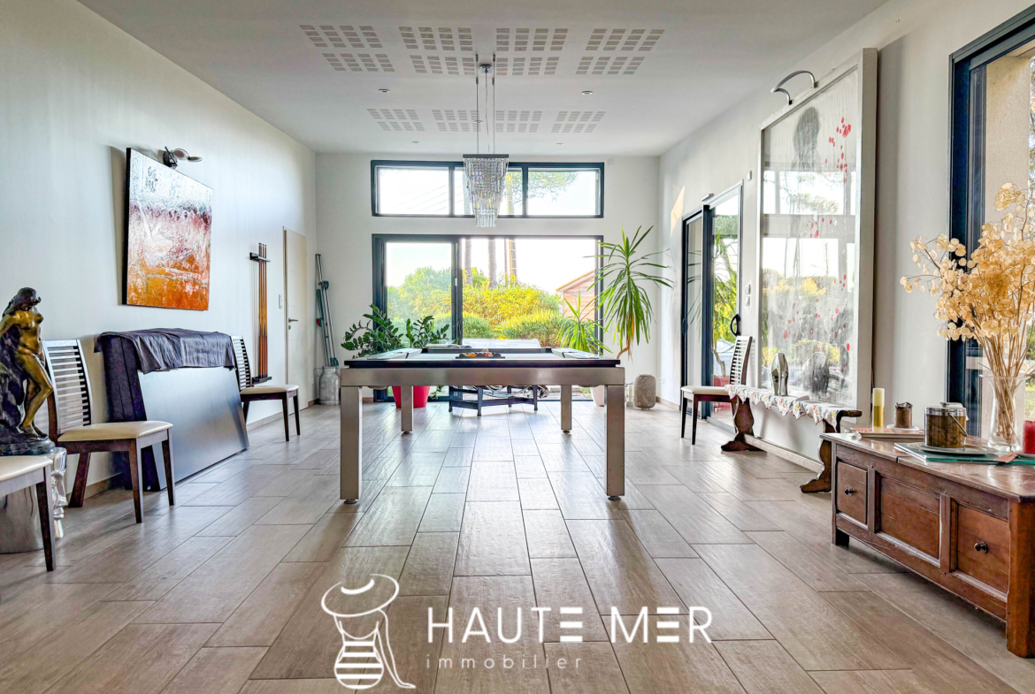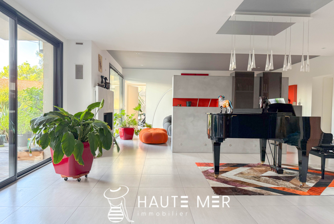 À quelques encablures de l’océan, dans le quartier recherché du domaine de la Pironnière, se dévoile une villa élégante de près de 300 m2, entourée d’un jardin paysager de 1 800 m2. La lumière y circule librement : l’espace de vie est rythmé par trois agréables pièces se prolongeant chacune sur le jardin paysagé. La cuisine et son espace repas, lieu de partage et de convivialité, profitent également de l’espace extérieur. La suite parentale, avec dressing et salle de bains, compose un refuge intime. Une chambre indépendante, dotée de sa salle d’eau, accueille vos hôtes en toute sérénité. À l’étage, deux chambres, un bureau lumineux et une salle de cinéma complètent l’ensemble. À l’extérieur, le jardin aux essences méditerranéennes guide vos pas vers une piscine chauffée, promesse de moments suspendus entre ciel et mer. Un triple garage ainsi qu’une spacieuse cave à vin complètent cette villa contemporaine. Un cadre de vie rare, où l’espace et la douceur de l’Atlantique se rencontrent.
