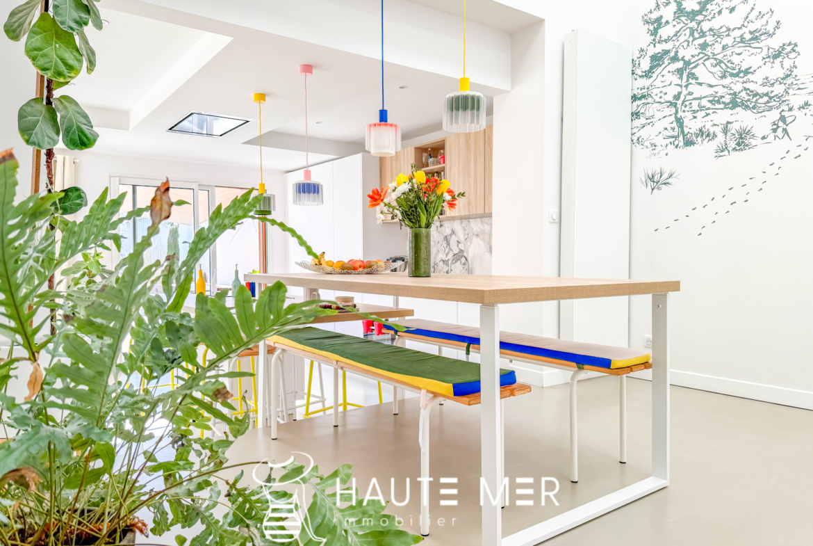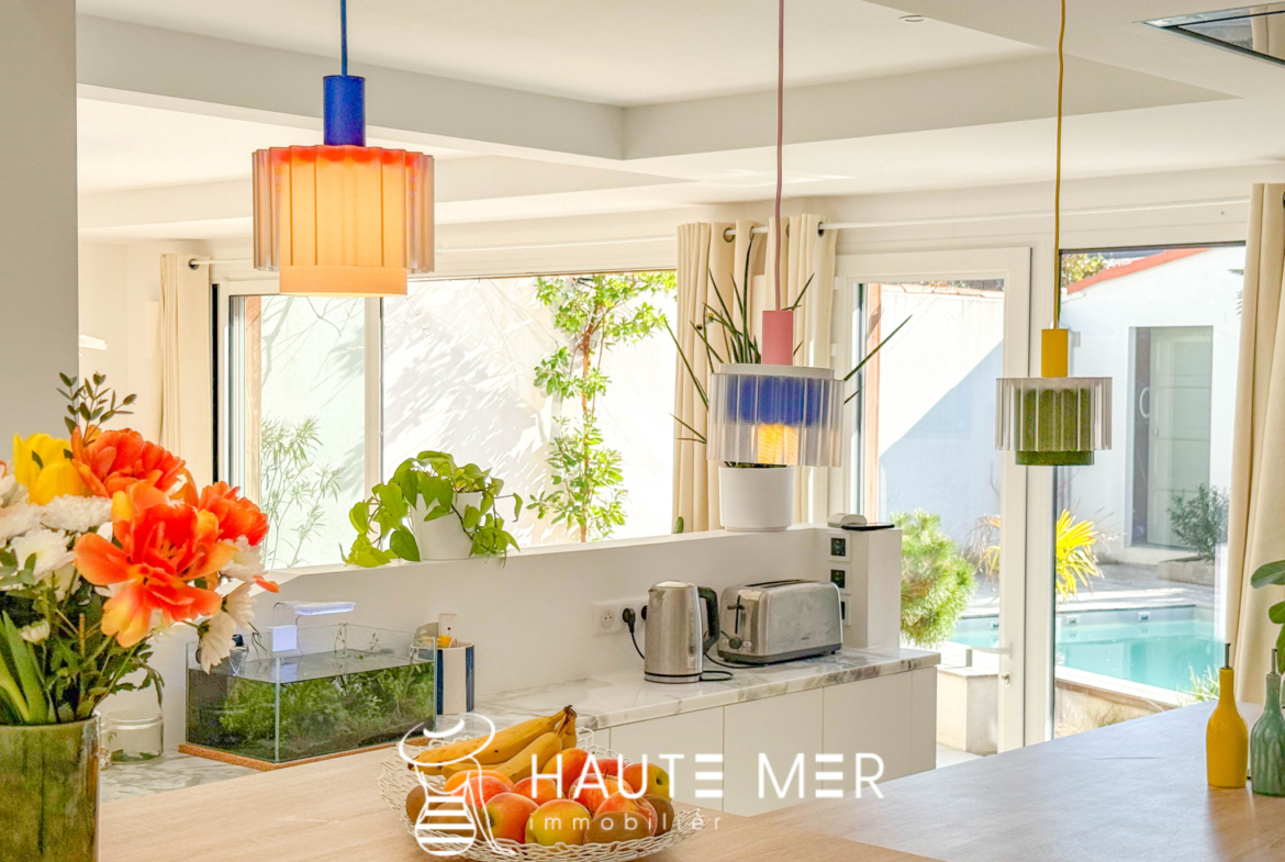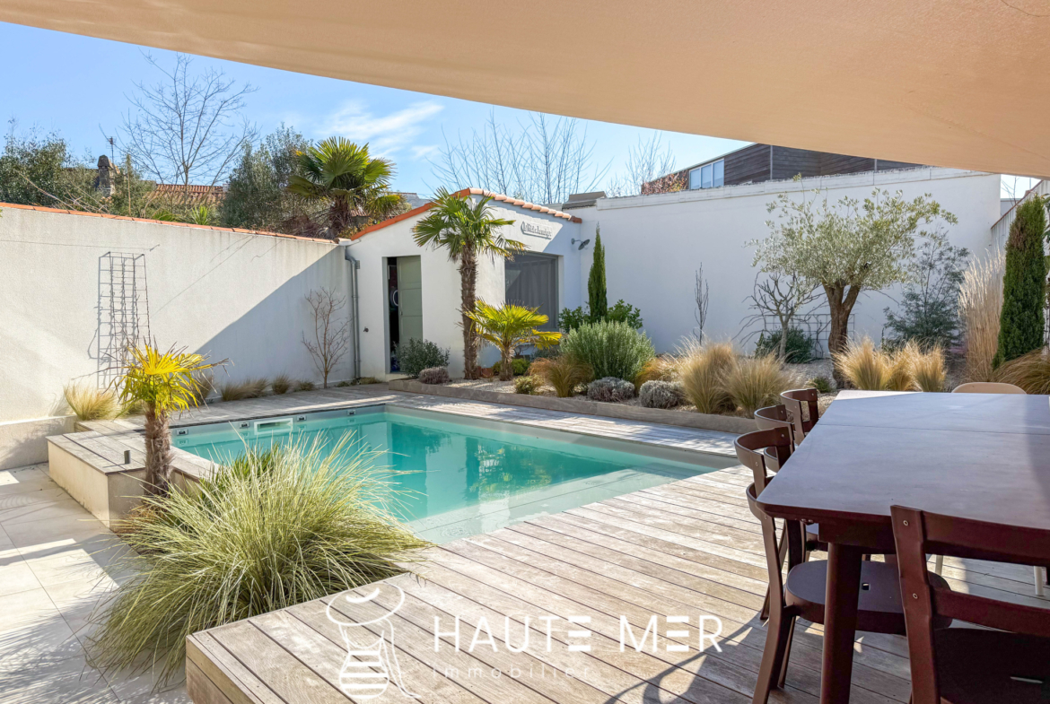 Au cœur du quartier très recherché des Présidents, cette villa entièrement repensée avec des matériaux haut de gamme dévoile une atmosphère à la fois chaleureuse et résolument contemporaine. Développant 166 m2 habitables, la maison s’organise autour d’un superbe espace de vie d’environ 50 m2, où séjour et cuisine équipée composent un lieu de réception convivial et lumineux. L’ensemble s’ouvre largement plein sud sur le jardin, offrant une belle continuité entre intérieur et extérieur. À l’abri des regards, le jardin paysager avec piscine devient un véritable espace de détente, baigné de lumière et propice aux moments partagés en toute intimité. La maison propose un bureau, cinq chambres, dont deux suites disposant de leur salle d’eau privative. Trois salles d’eau au total, de nombreux rangements intégrés, une buanderie, une cave ainsi qu’un garage confortable viennent compléter les prestations de cette propriété familiale aux volumes parfaitement maîtrisés. À l’étage, une terrasse supplémentaire offre un espace extérieur privilégié, idéal pour profiter des douces fins de journée. L’adresse constitue l’un de ses atouts majeurs : la plage des Présidents et l’ensemble des commerces se rejoignent à pied, à moins de 500 mètres. Une villa élégante et parfaitement rénovée, située dans l’un des quartiers les plus prisés du littoral sablais, où la douceur de vivre se conjugue naturellement avec la proximité de l’océan.