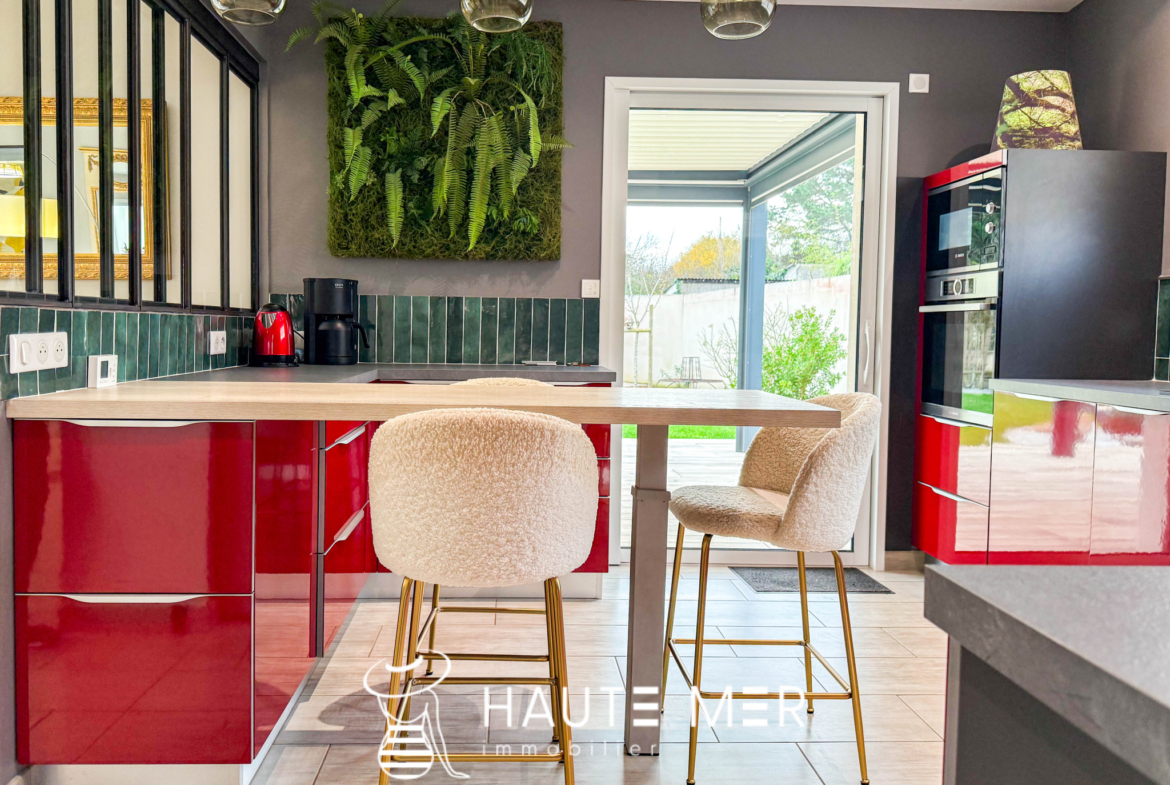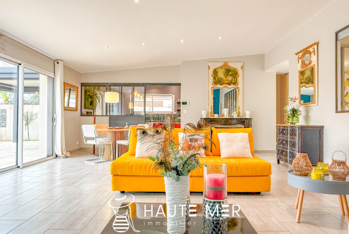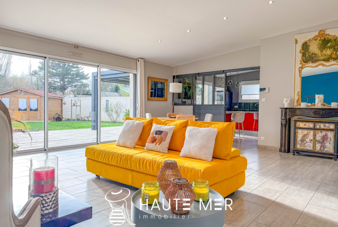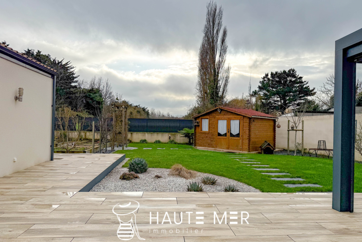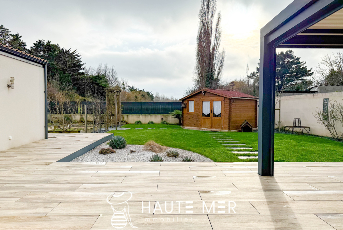À proximité de la côte sauvage et à quelques minutes de Port Olona, cette élégante villa de plain-pied se dévoile en fond d’impasse, dans un environnement paisible et verdoyant. Développant plus de 200 m2, elle séduit par ses volumes généreux, sa circulation fluide et sa relation constante avec l’extérieur. Dès l’entrée, la lumière s’impose naturellement. La vaste pièce de vie s’ouvre largement sur le jardin grâce à de grandes baies à galandage et s’articule autour d’un patio central pensé comme un véritable espace de détente, avec jacuzzi et toiture vitrée rétractable. La cuisine, séparée par une verrière, affirme un style haut de gamme et fonctionnel, prolongée par une buanderie et un accès direct à la terrasse. L’espace nuit se compose d’une suite parentale indépendante, tournée vers le jardin, avec dressing sur mesure et salle d’eau privative. Une seconde aile accueille deux chambres confortables, une salle d’eau élégante et un bureau lumineux à l’esprit atelier. Un bureau de 18 m2 vient compléter l’ensemble. À l’extérieur, le jardin clos de 840 m2 exposé sud offre un cadre intime et soigné : grande terrasse avec pergola bioclimatique, jardin paysagé, potager et espace de rangement. Un double garage et plusieurs stationnements complètent cette propriété.
