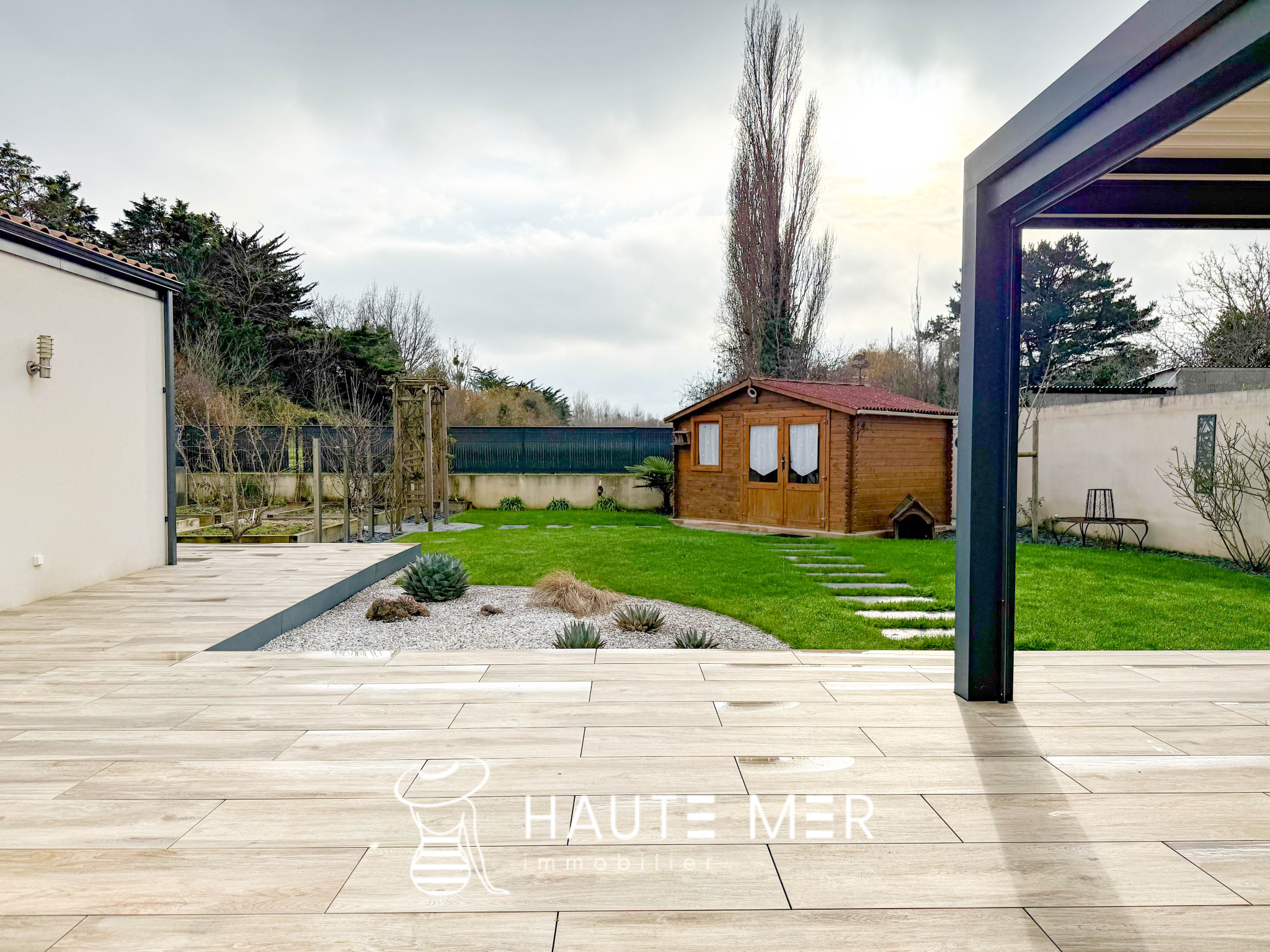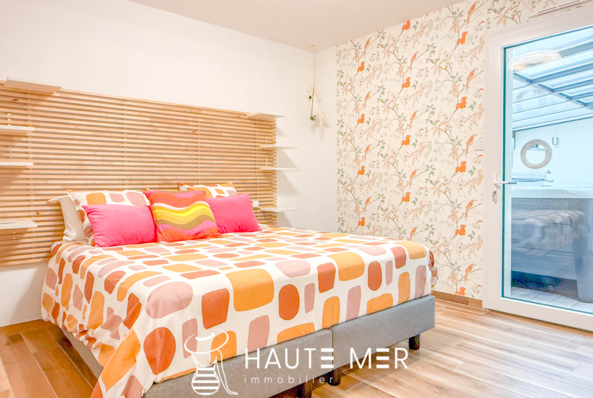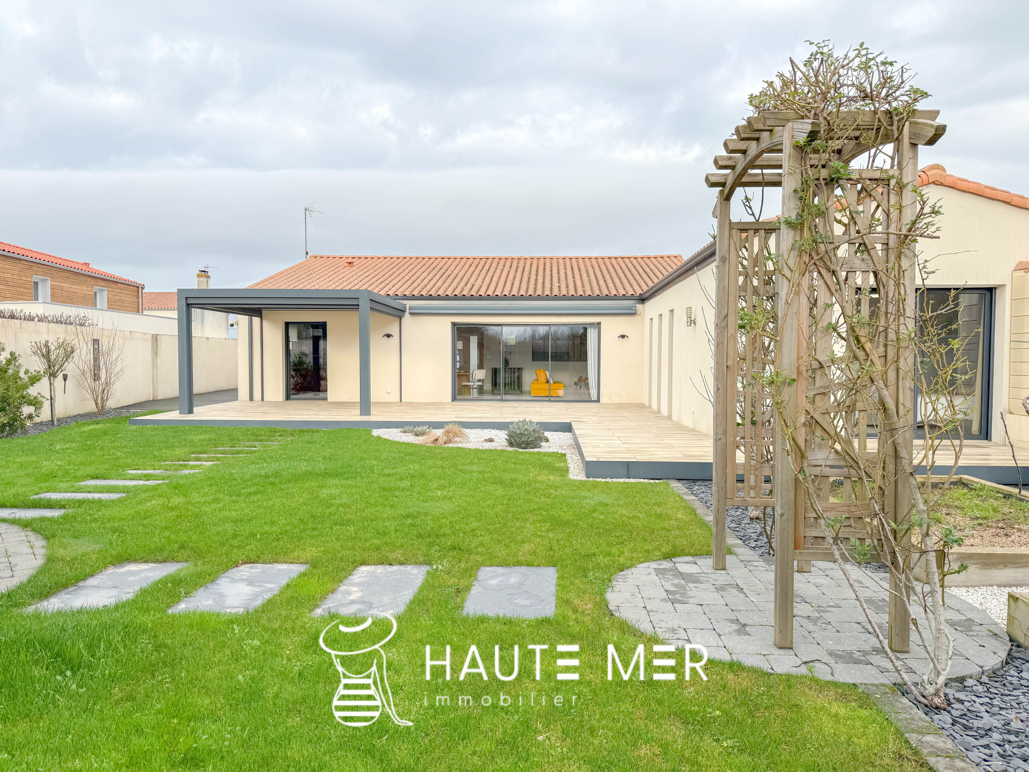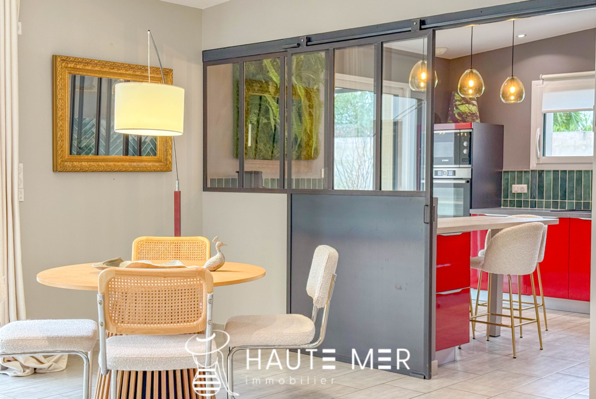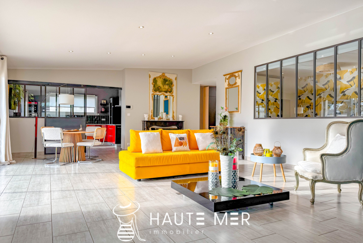 À proximité de la côte sauvage et à quelques minutes de Port Olona, cette élégante villa de plain-pied se dévoile en fond d’impasse, dans un environnement paisible et verdoyant. Développant plus de 200 m2, elle séduit par ses volumes généreux, sa circulation fluide et sa relation constante avec l’extérieur. Dès l’entrée, la lumière s’impose naturellement. La vaste pièce de vie s’ouvre largement sur le jardin grâce à de grandes baies à galandage et s’articule autour d’un patio central pensé comme un véritable espace de détente, avec jacuzzi et toiture vitrée rétractable. La cuisine, séparée par une verrière, affirme un style haut de gamme et fonctionnel, prolongée par une buanderie et un accès direct à la terrasse. L’espace nuit se compose d’une suite parentale indépendante, tournée vers le jardin, avec dressing sur mesure et salle d’eau privative. Une seconde aile accueille deux chambres confortables, une salle d’eau élégante et un bureau lumineux à l’esprit atelier. Un bureau de 18 m2 vient compléter l’ensemble. À l’extérieur, le jardin clos de 840 m2 exposé sud offre un cadre intime et soigné : grande terrasse avec pergola bioclimatique, jardin paysagé, potager et espace de rangement. Un double garage et plusieurs stationnements complètent cette propriété.