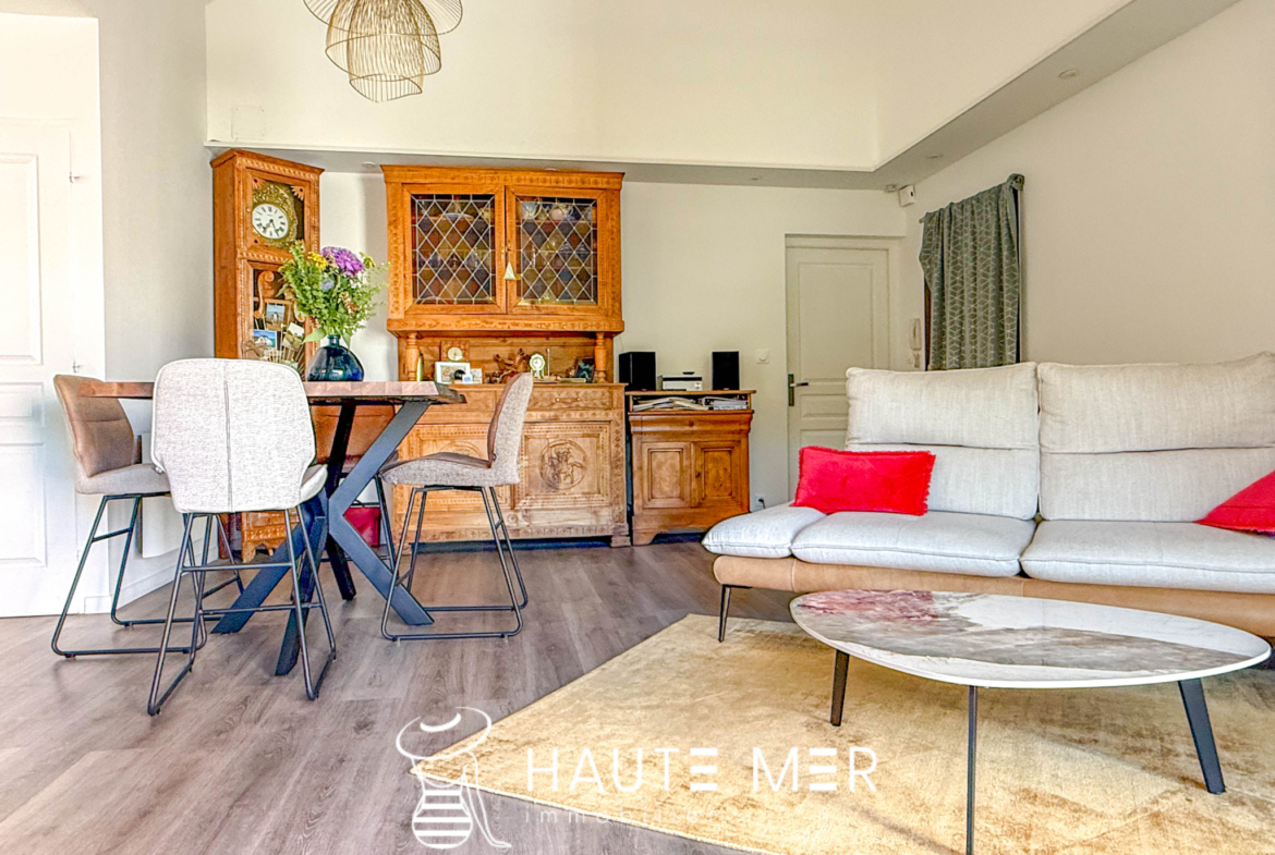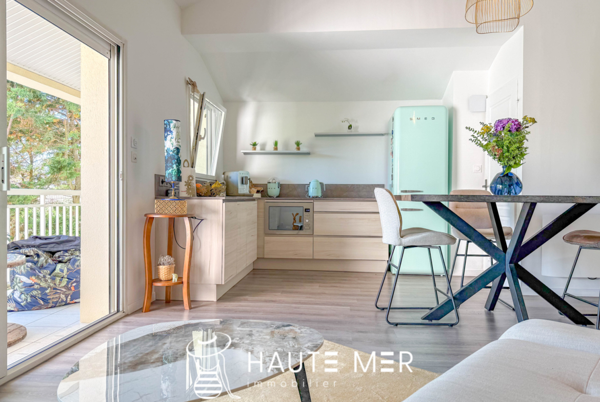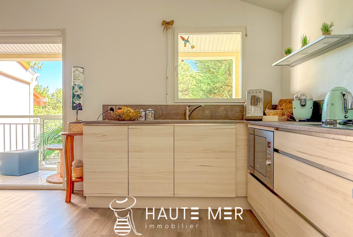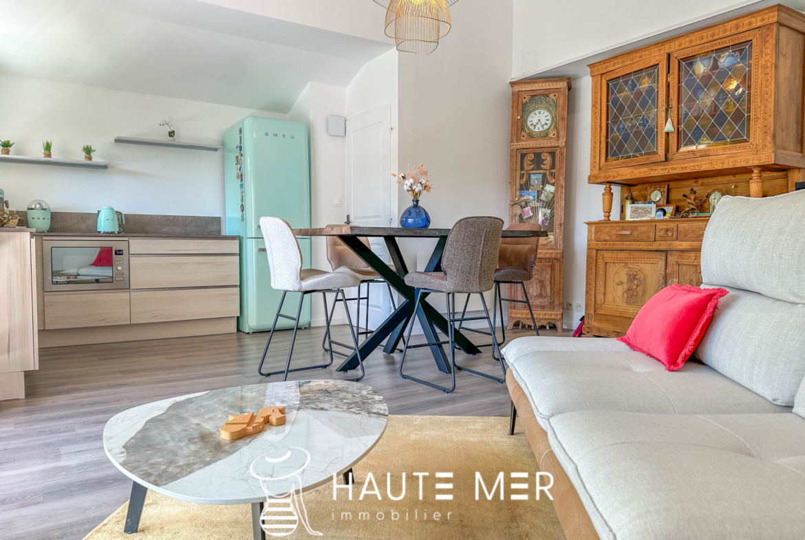 Idéalement situé à proximité immédiate des commerces et du littoral, cet appartement de type 3 s’inscrit dans un environnement résidentiel paisible, conjuguant confort et qualité de vie. Au sein d’une résidence soigneusement entretenue, ce bien séduit dès l’entrée par sa luminosité naturelle et ses volumes généreux. La pièce de vie, sublimée par un plafond cathédrale, propose une ambiance chaleureuse et contemporaine avec une cuisine ouverte aménagée et un séjour convivial, le tout prolongé par une terrasse surplombant un écrin de verdure. L’espace nuit, bien séparé, préserve l’intimité avec deux chambres, dont une spacieuse de plus de 15 m2, toutes deux ouvrant sur un balcon orienté au calme. Une salle d’eau aux prestations raffinées complète harmonieusement l’ensemble. En annexes, vous bénéficierez d’une cave et d’une place de stationnement privative. Un garage fermé peut également être acquis en supplément.