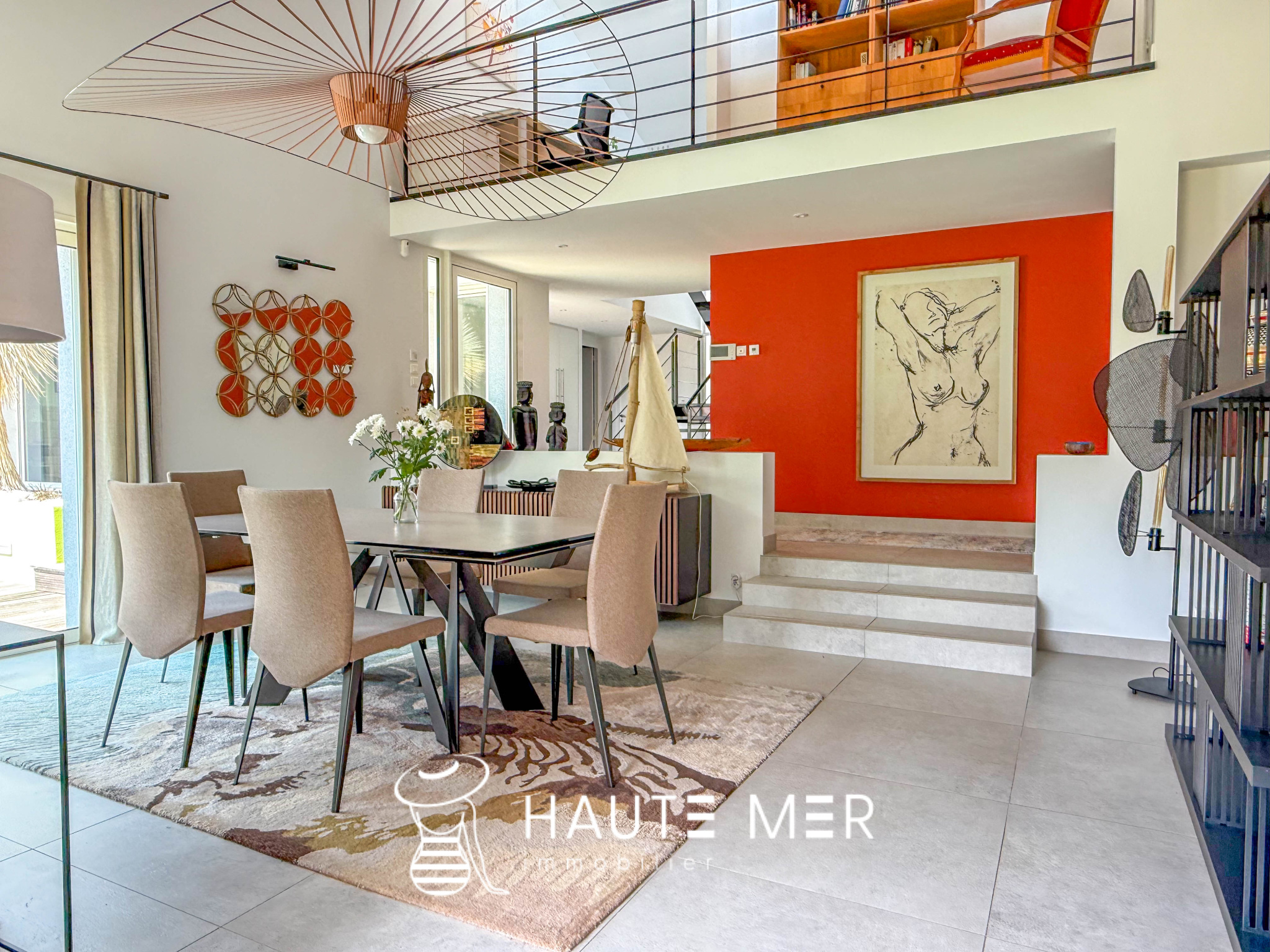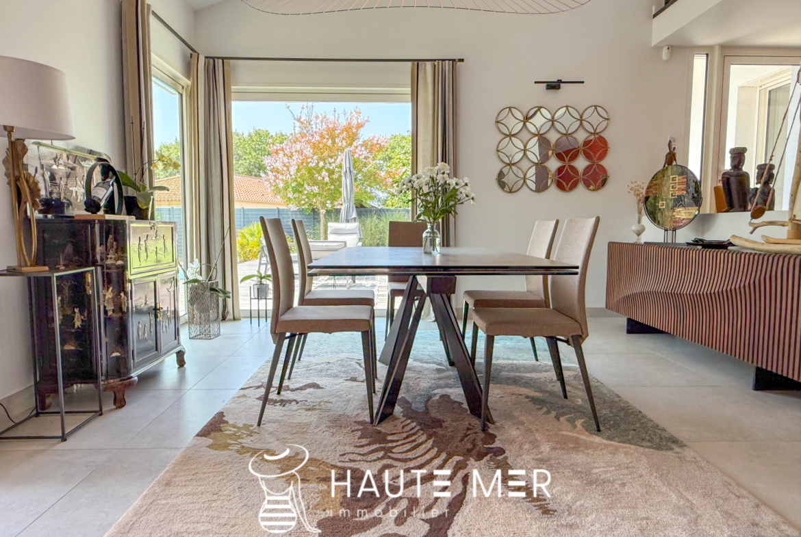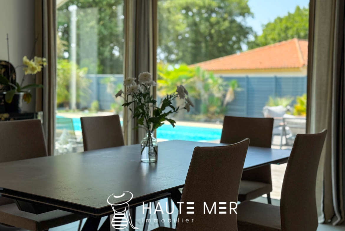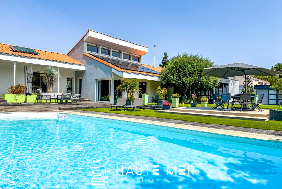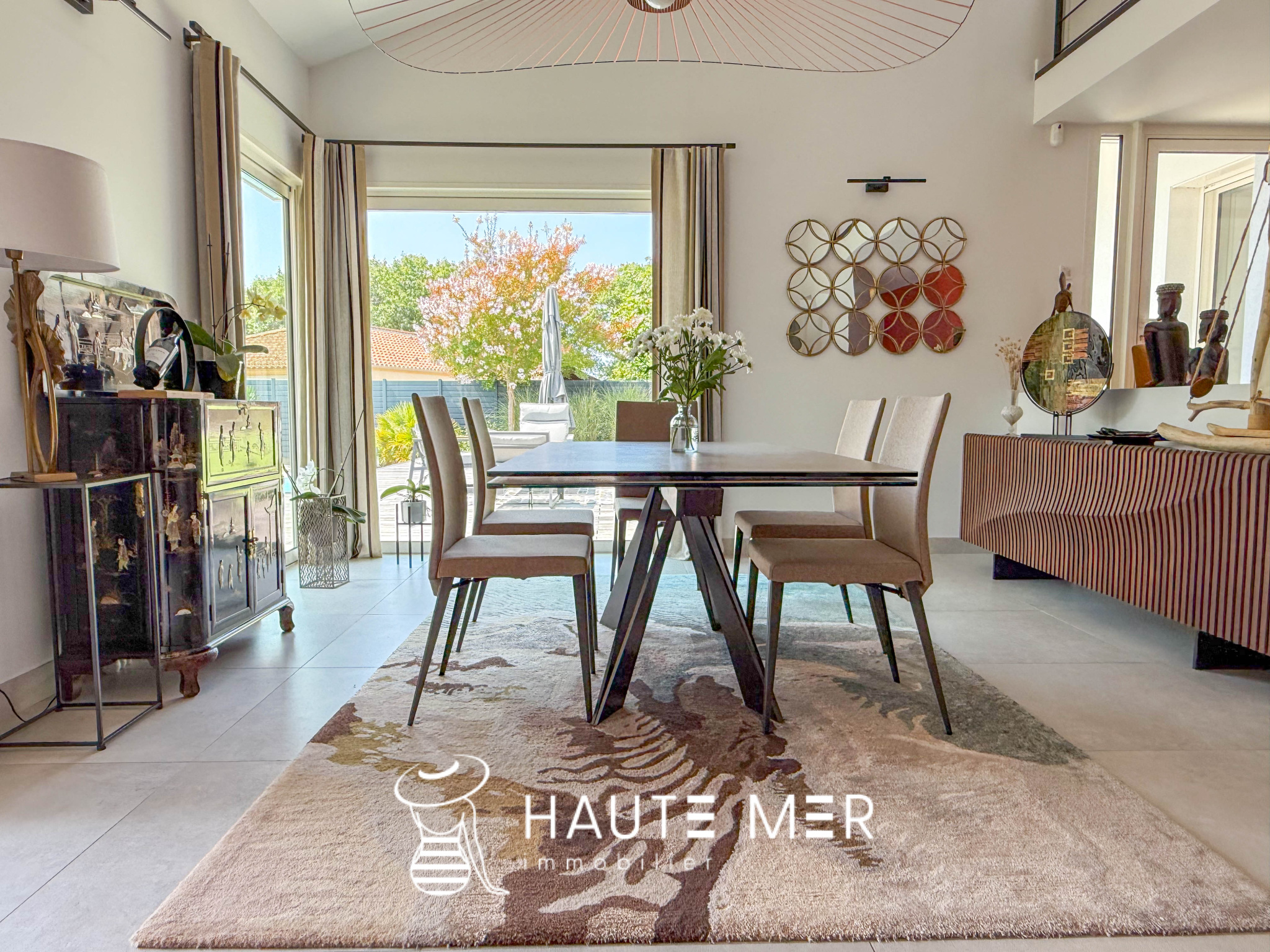 Dans un quartier résidentiel paisible et soigné, à deux pas des commerces et à quelques minutes des plages, cette villa d’architecte de 204 m2 vous surprendra dès les premiers instants. Derrière sa façade discrète, l’intérieur révèle une ambiance lumineuse et généreuse, portée par de beaux volumes, une hauteur sous plafond impressionnante et une architecture unique. Dès l’entrée, le charme opère : un vaste hall qui s’ouvre sur un salon baigné de lumière, animé par une cheminée contemporaine. La spacieuse cuisine, haut de gamme et ouverte, séduira les amateurs de partage. Un salon d’hiver fait le lien avec l’extérieur, offrant une vue apaisante sur la piscine.Côté nuit, la maison propose une chambre avec salle d’eau et dressing au rez-de-chaussée, une seconde chambre s’orientant sur le jardin et une salle de bains complètent cet espace. À l’étage, une mezzanine esprit loft accueille un bureau, menant à une deuxième chambre avec salle d’eau privative, idéale pour recevoir. Un spacieux garage, une buanderie et un bureau complètent le confort de la villa.À l’extérieur, l’ambiance est douce et préservée : un jardin plein sud sans vis-à-vis, deux terrasses, une piscine chauffée parfaitement intégrée… ici, tout est réuni pour savourer les saisons, en toute quiétude.