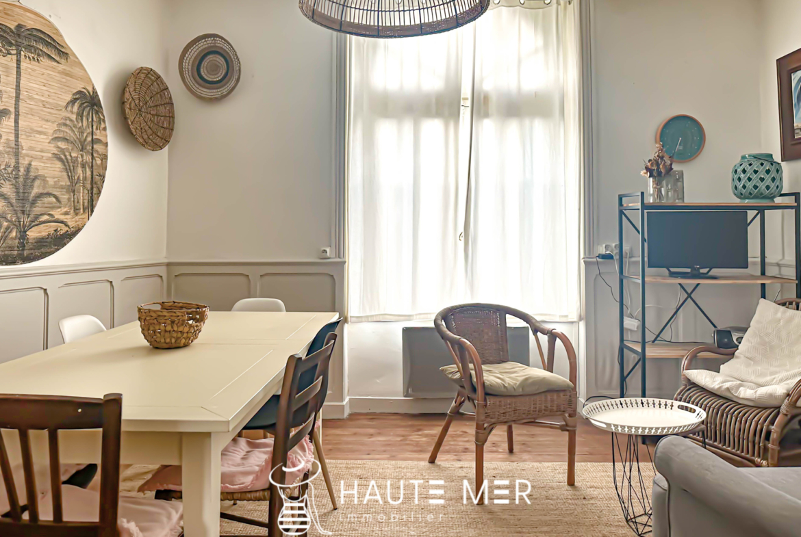 Proche de la grande plage, une ancienne bâtisse abrite un lieu rénové au charme préservé. Passée l’entrée, la salle de séjour sur son parquet d’époque s’ouvre sur une cuisine équipée. L’espace nuit est composé de 2 chambres et d’une salle d’eau. Parfaitement optimisés, les espaces offrent des rangements ainsi qu’une courette et une cave. Sa position centrale permet une vie agréable, à quelques mètres de la grande plage et des commerces. L’agence HAUTE MER IMMOBILIER apprécie particulièrement cet appartement pour son charme incontestable et son emplacement de premier choix.