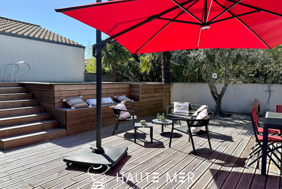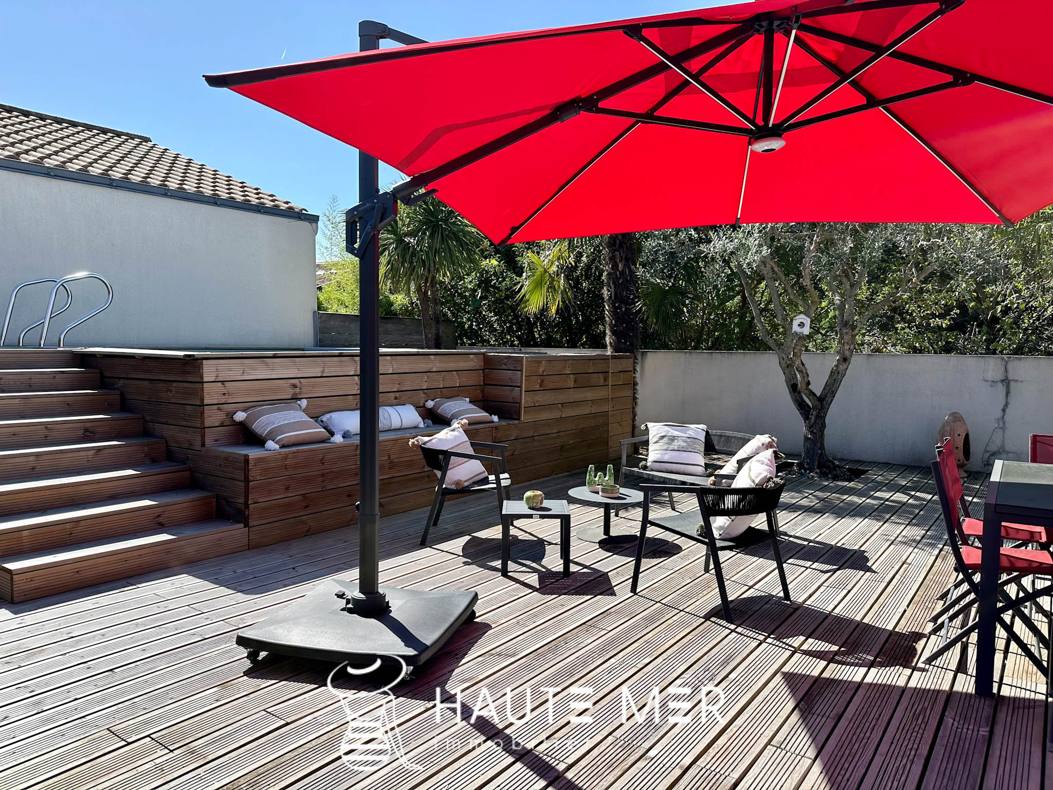 Dissimulée à l’abri des regards dans le quartier de Tanchet, cette maison contemporaine est pensée comme un havre de paix invitant à la douceur de vivre. La maison s’articule autour de baies vitrées dirigées vers l’espace extérieur, vous apprecierez ainsi la luminosité de l’espace à vivre et de la cuisine équipée ainsi que celle du vaste bureau s’orientant sur la terrasse dotée d’une piscine chauffée. Côté nuit, la maison offre 2 espaces disctints accueillant ainsi une suite parentale avec une salle d’eau privative et un dressing et 2 autres chambres avec salle de bains. Conçue comme un lieu de vie confortable et familiale, la maison dispose de nombreux placards, d’un cellier et d’un garage. Cette maison résolument fonctionnelle vous séduira par ses volumes et son emplacement idéal à moins d’1km de la plage et des commerces.