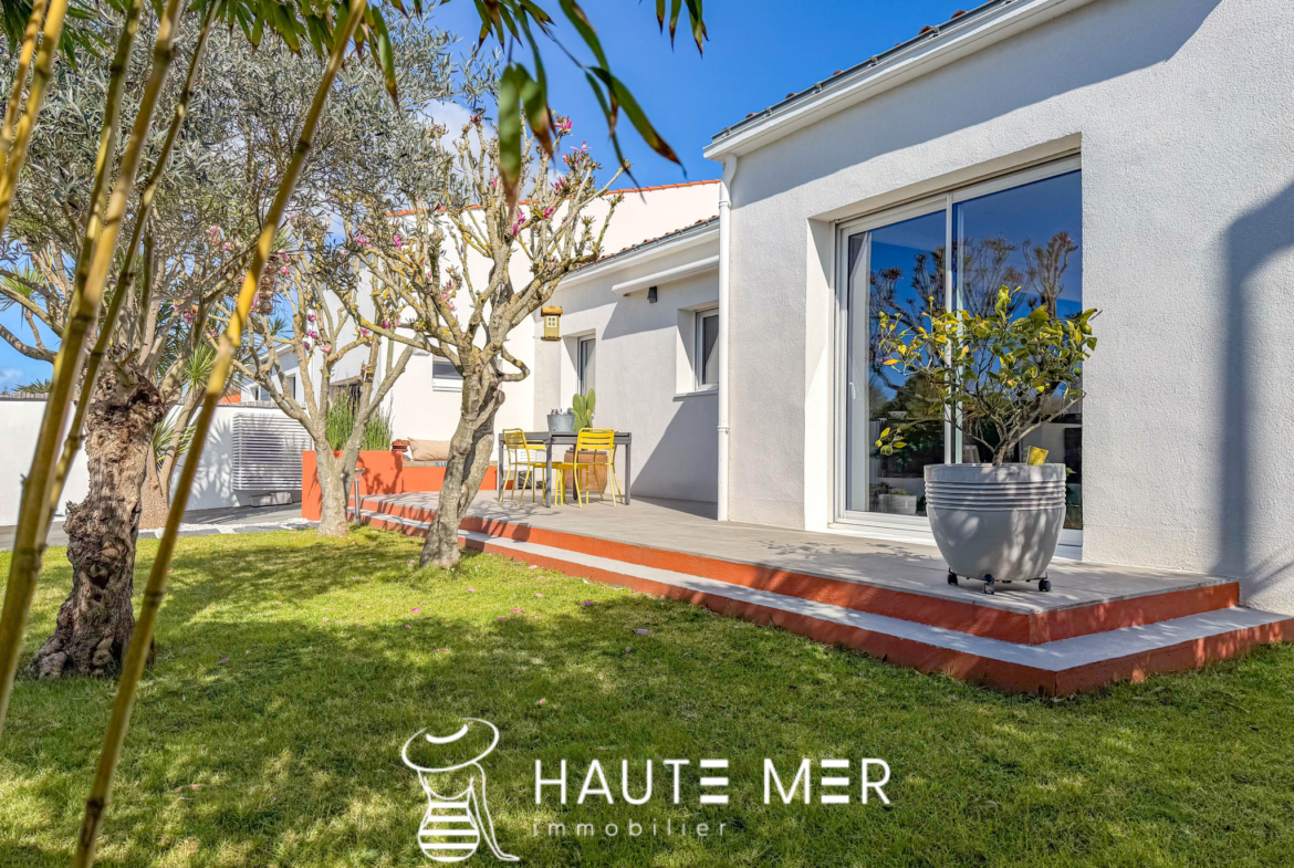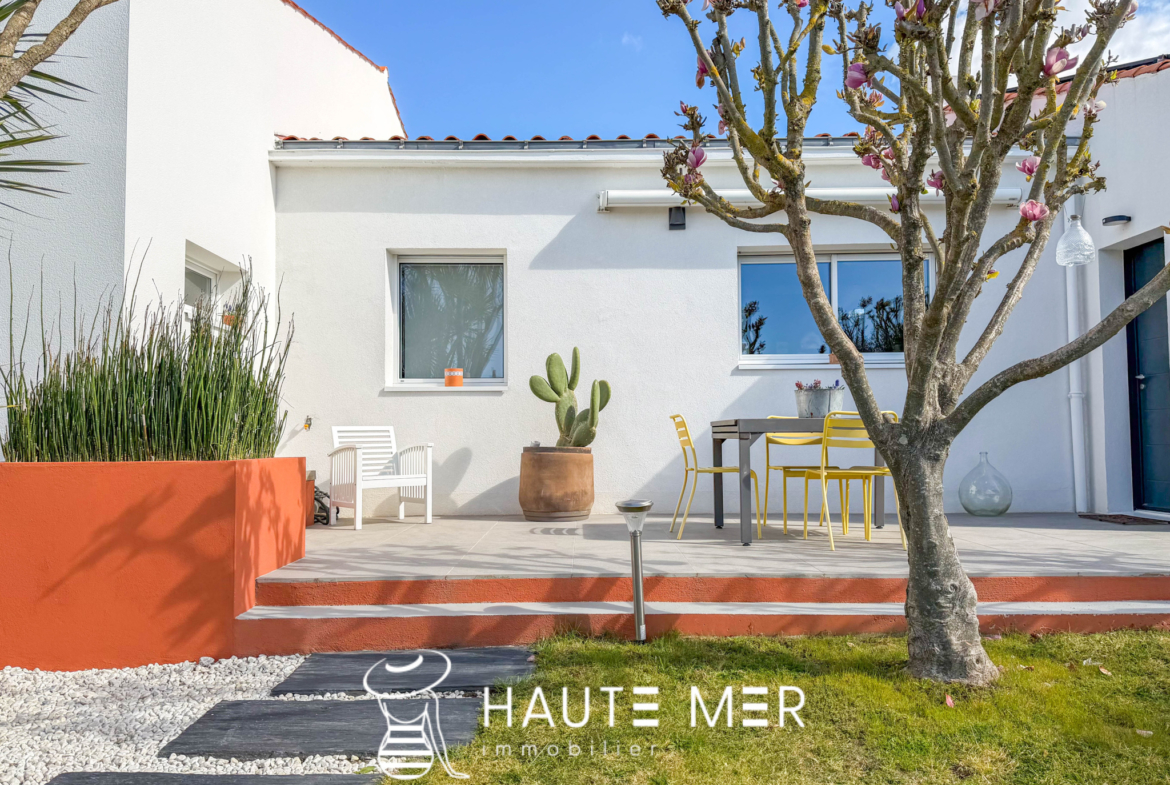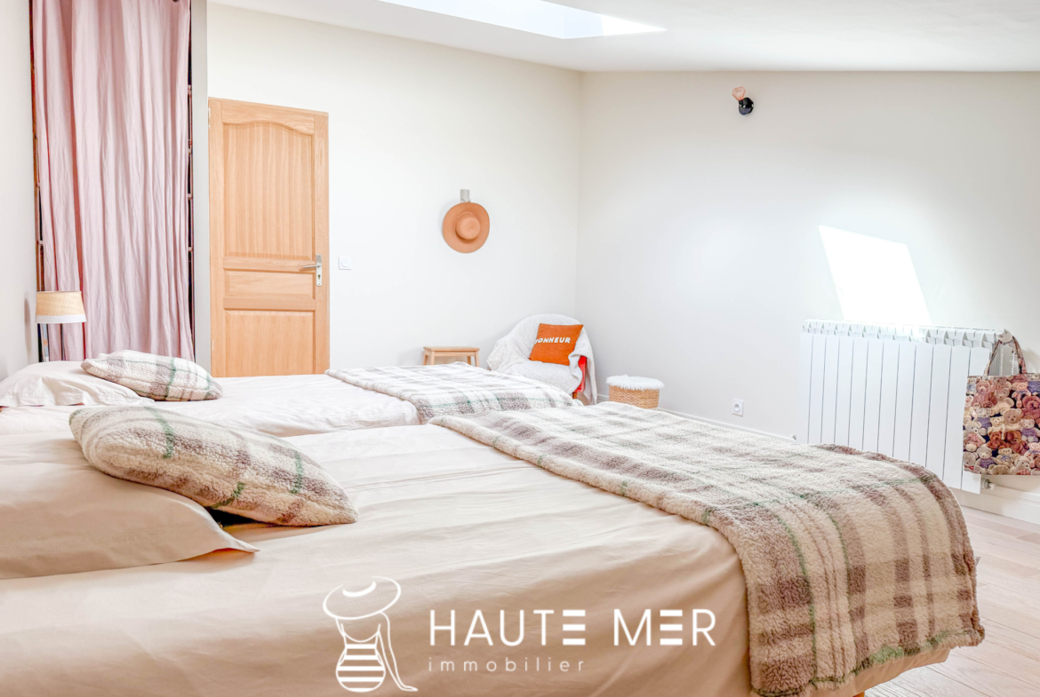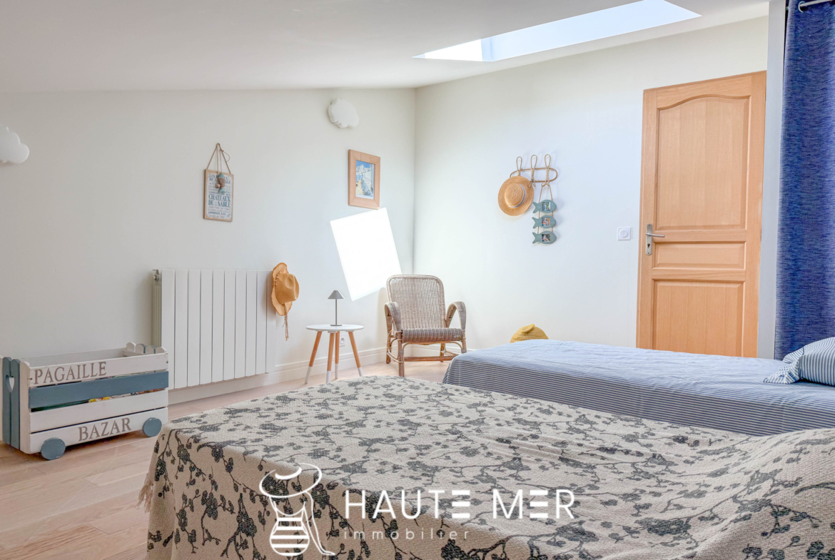 Située à 500 mètres du bourg de La Pironnière et à 900 mètres de l’océan, cette maison entièrement rénovée séduit par la qualité de ses finitions, où chaque détail a été soigneusement pensé. L’entrée s’ouvre sur une pièce de vie lumineuse, composée d’un salon-séjour aux volumes généreux, prolongé par une cuisine aménagée et équipée, conviviale et parfaitement intégrée. Un espace offrant de beaux volumes et une circulation fluide, idéale pour le quotidien comme pour recevoir. La maison propose une organisation fonctionnelle avec deux espaces nuit distincts. Le premier dessert deux chambres confortables accompagnées d’une salle d’eau. Le second offre une troisième chambre spacieuse en rez-de-chaussée, complétée à l’étage par deux chambres supplémentaires se partageant une salle de bains. À l’extérieur, le jardin paysagé exposé plein sud constitue un véritable havre de paix, sublimé par une agréable terrasse propice à la détente. La configuration de la maison permet également d’envisager l’exploitation d’une partie en logement de vacances, idéale pour développer une activité ou générer un complément de revenus. Une buanderie ainsi qu’un garage viennent compléter les prestations de ce bien.